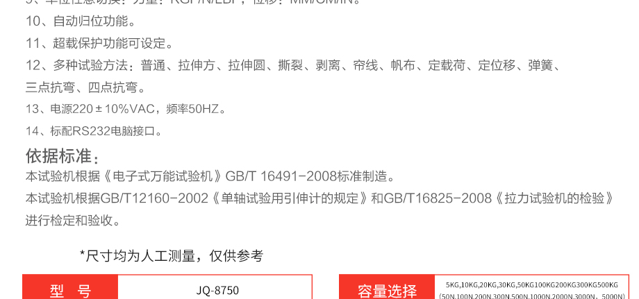 產(chǎn)品型號:JQ-8750 品牌:劍 喬 用途:本系列機廣泛用于各類五金、金屬、塑膠、橡膠料、紙品、包裝、鞋類、皮革、服裝、紡織、建材、絕緣體、電線、電纜、端子等各類材料。測試其拉伸、撕裂、剝離、抗壓、彎曲、抗剪切、定